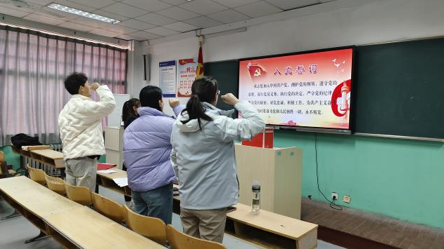 接下来,由学生第二党支部书记苗雨露带领刘珂欣、陆思敏、李赛三名同志宣读入党誓词,成为一名正式的中共党员。