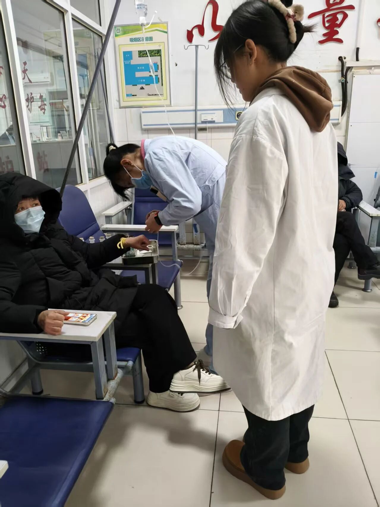 最难忘的是输液大厅的经历。协助护士为一位阿姨进行静脉穿刺,她衣物厚重,血管暴露不佳,护士老师一边轻声安抚一边熟练操作。当针头顺利刺入,阿姨的夸赞让我明白,共情与耐心是护理工作的温度所在。之后我常帮阿姨倒水、调整座椅,她出院时的一句“你像我的孩子一样贴心”,让我体会到被患者信任的温暖。