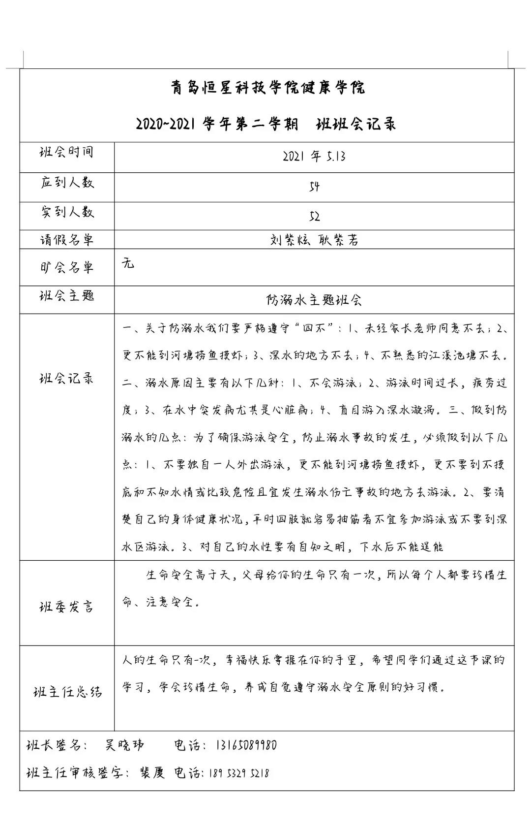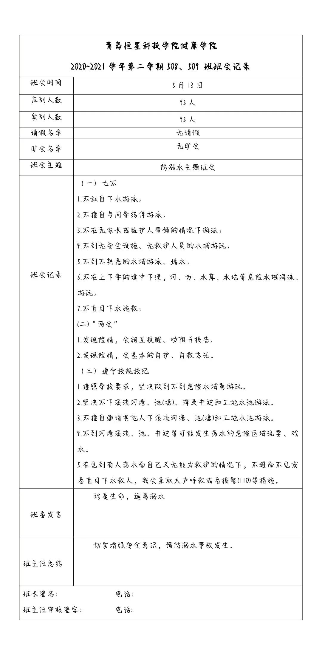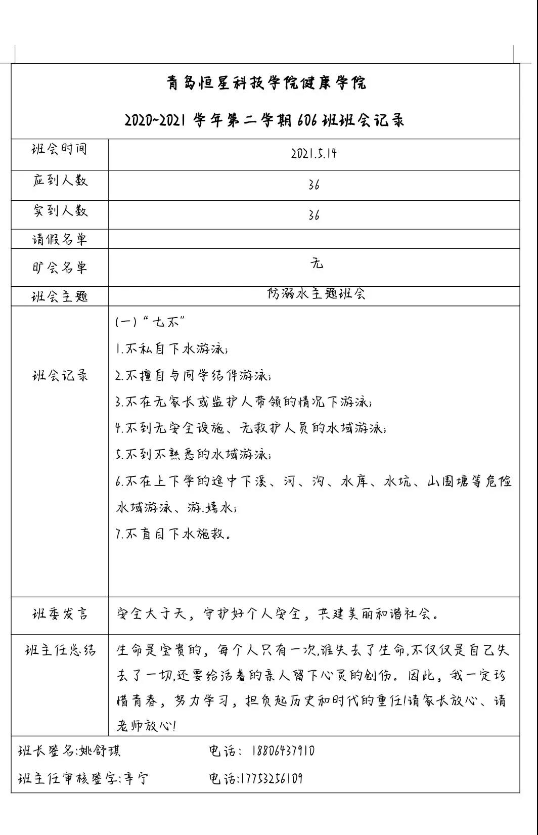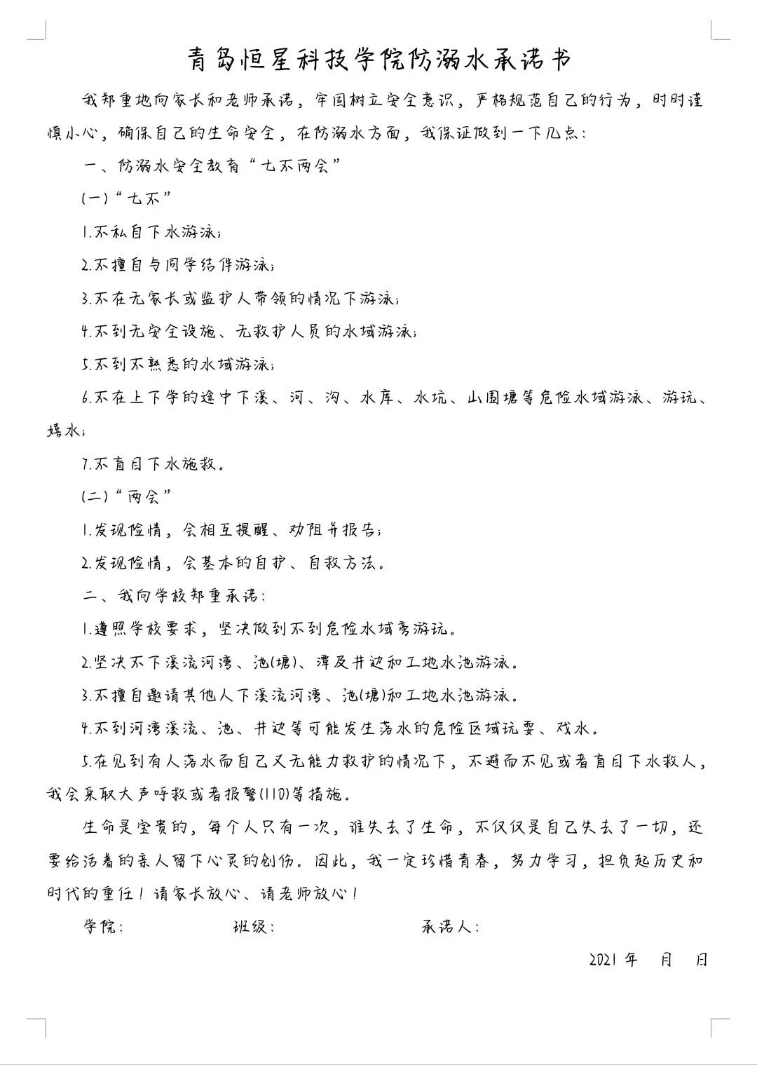 防溺水安全重于泰山。溺水事件的频发也值得我们深思。溺水事件的发生,既有防溺水设施的缺位、漏位,也有遇溺学生对防溺水知识的缺乏。为提高学生防溺水意识,2021年5月13日青岛恒星科技学院健康学院组织各班举行防溺水主题班会及签署防溺水承诺书活动。
