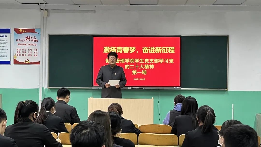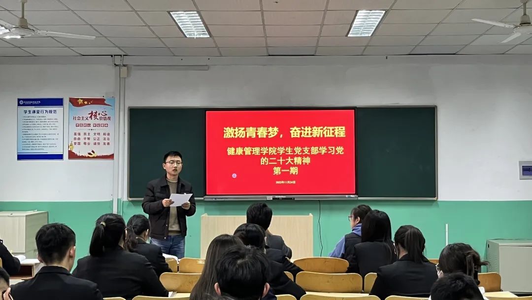 为积极响应党的二十大会议的顺利召开,经健康管理学院党总支研究决定,2022年11月24日在A8-603进行青岛恒星科技学院健康管理学院学生党支部“激扬青春梦,奋进新征程”党的二十大精神主题学习,参加本次活动的有健康管理学院学生党支部全体党员和发展对象,会议由学生党支部组织委员王保清主持。