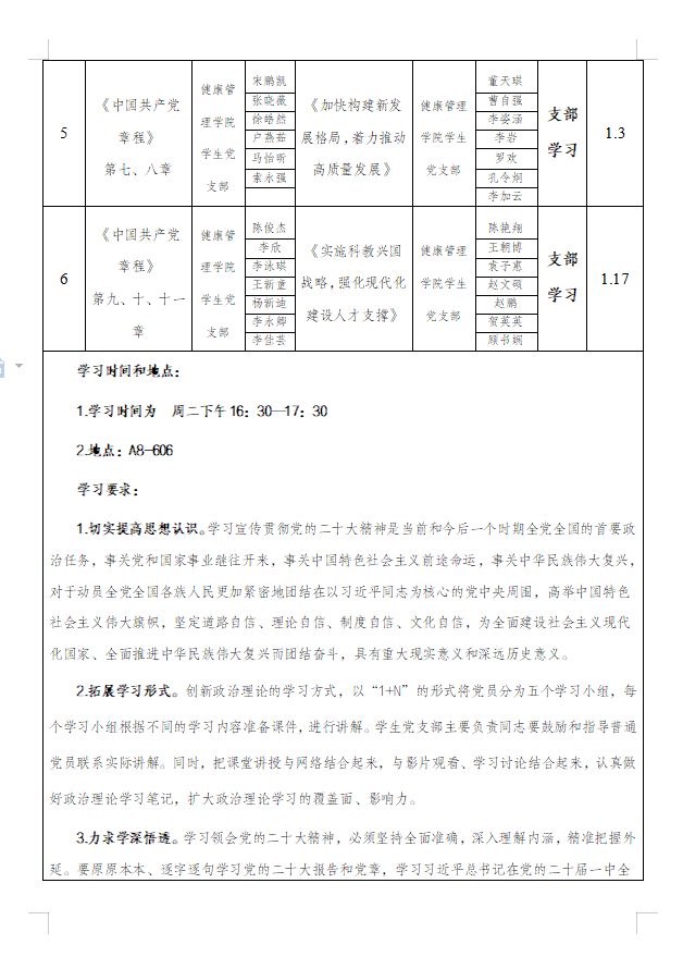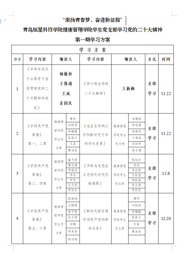 下图为青岛恒星科技学院健康管理学院学生党支部学习党的二十大精神第一期学习方案。