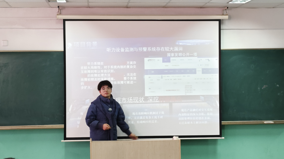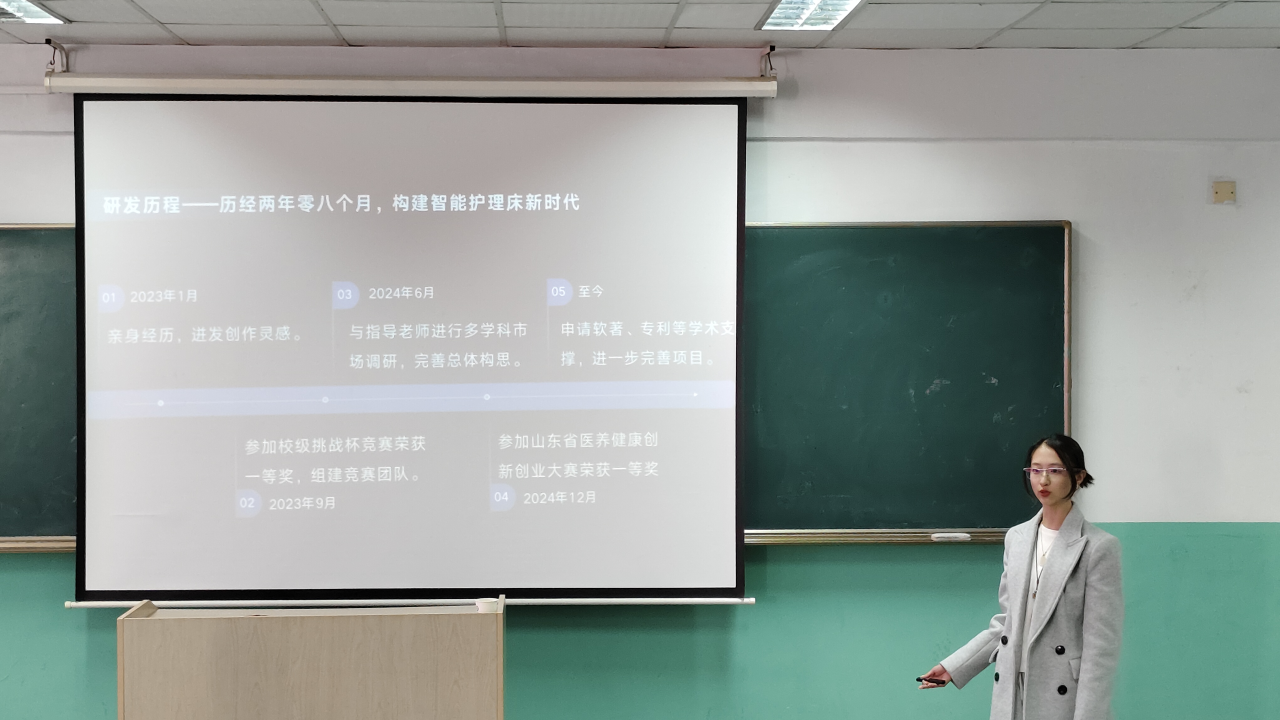 比赛现场,每位主讲人都充满自信。他们从容地站在讲台上,用独特的视角和饱满的热情,分享各自精心准备的创新创业项目。从智能医疗设备到社区健康管理方案,选手们结合数据图表和实际案例,将创新理念生动地呈现给现场评委。各项目团队以多元化的创新成果展现了科技与健康的深度融合。每个项目都通过实物展示、动态演示及数据讲解,引得评委频频驻足。