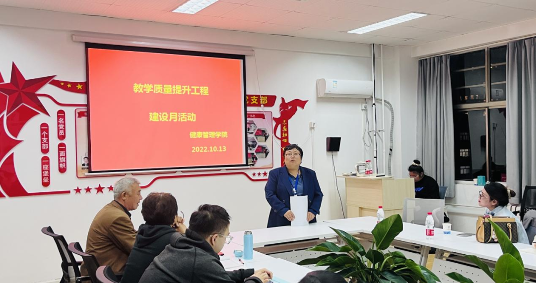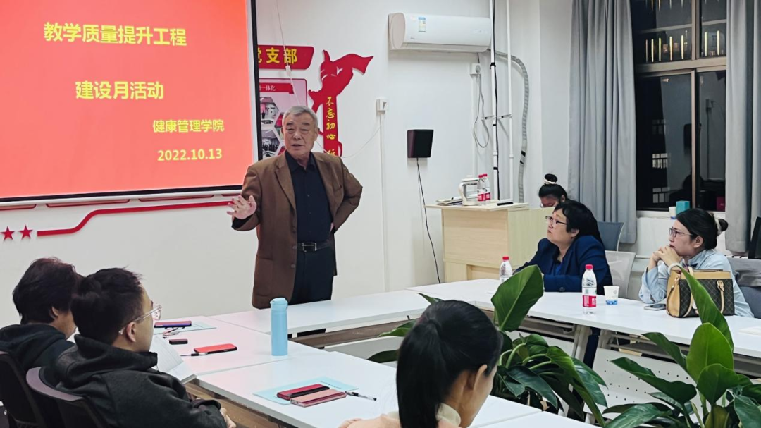 2022年10月13日,健康管理学院在A8传习楼513办公室举行“教学质量提升工程建设”活动,会议由王婧院长主持,学院全体教师参加。本次活动特邀我校丁效华校长作教学研究的专题讲座,并邀请山东省青年教师教学比赛一等奖获得者姜文琼教授传经送宝。