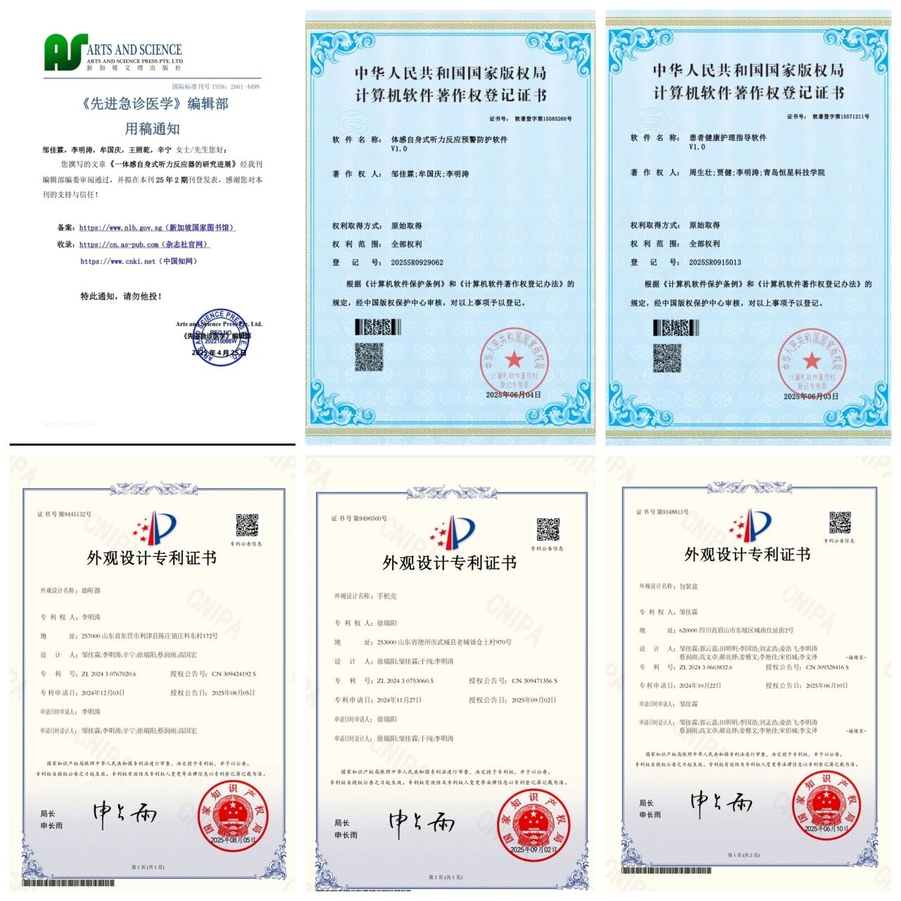 在专业与创新的领域,李明涛持续探索:参与研发的项目斩获3项外观设计专利(助听器、配套包装盒、手机壳)与2项软件著作权(体感自身式听力反应预警防护软件、患者健康护理指导软件),实现护理学需求与技术创新的双重结合。