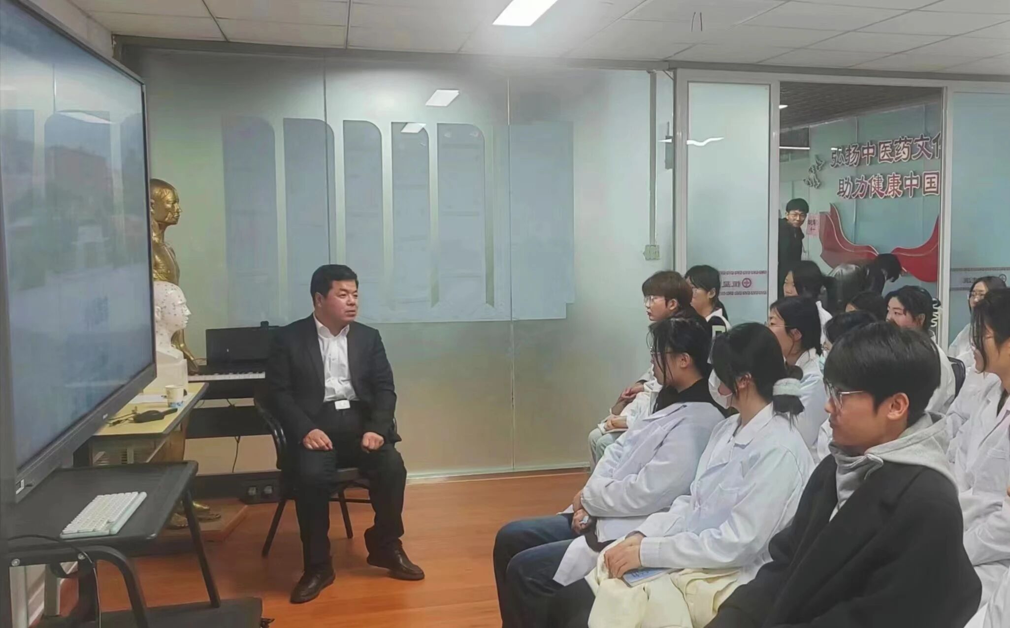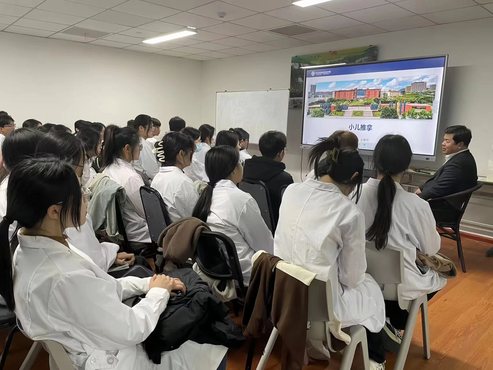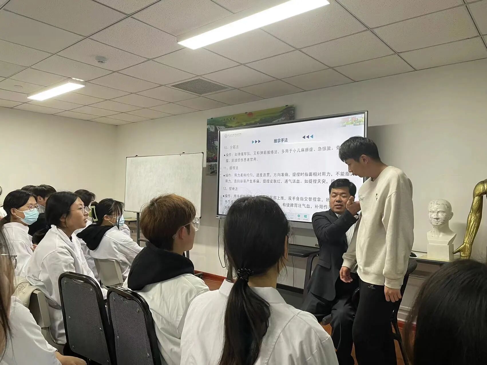 在培训过程中,王老师除了为同学们讲解推拿手法及人体的经络穴位分布,更用自身宝贵的经验供同学们参考,同学们听的格外认真,现场氛围非常活跃。