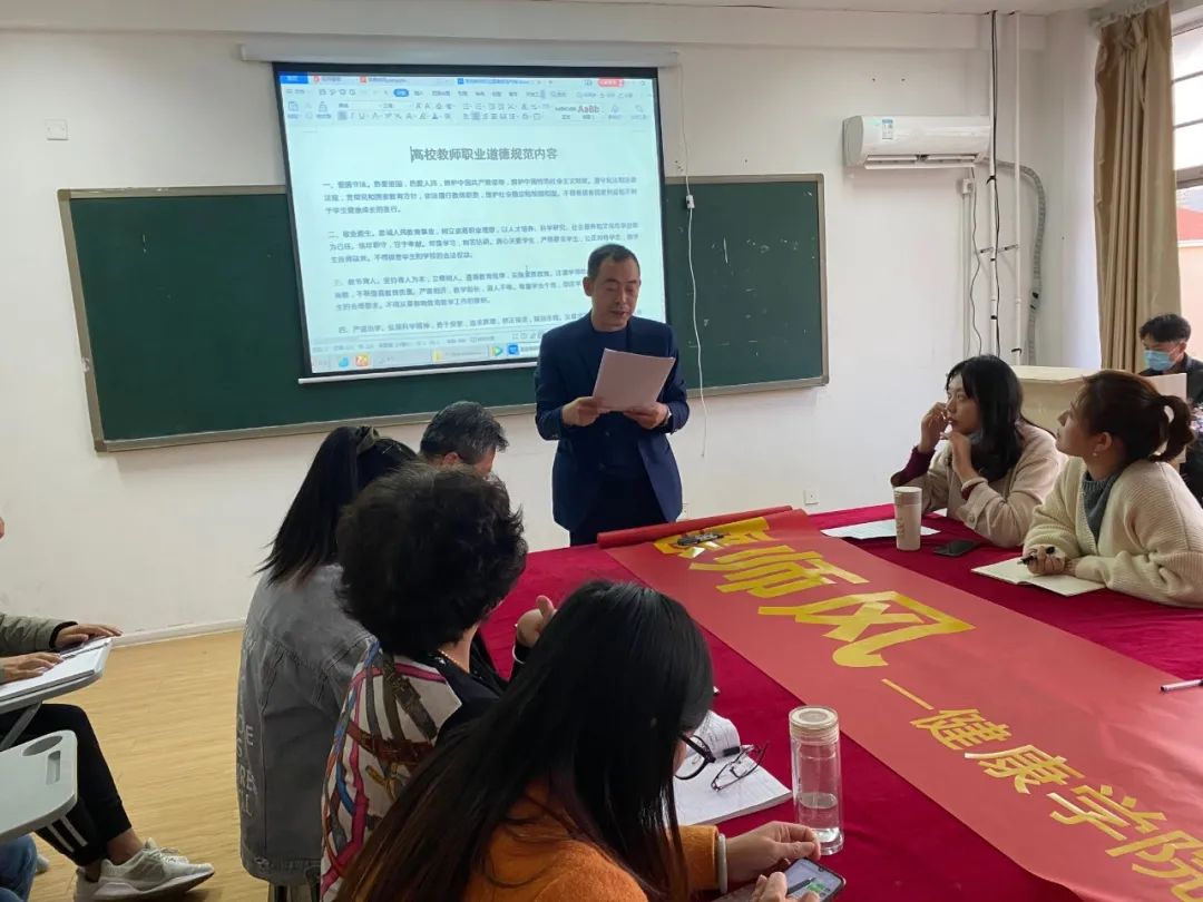 活动第二项,由副书记钱同新同志为各位教师讲解了高校教师职业规范内容及新时代高校教师职业行为十项准则。钱同新同志特此指出教师要坚持做到坚定政治方向、潜心教书育人等各项行为准则,并为全体教师明确爱国守法、敬业爱生等各项教师职业规范内容。