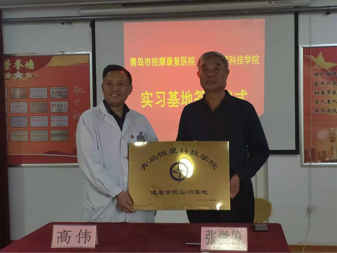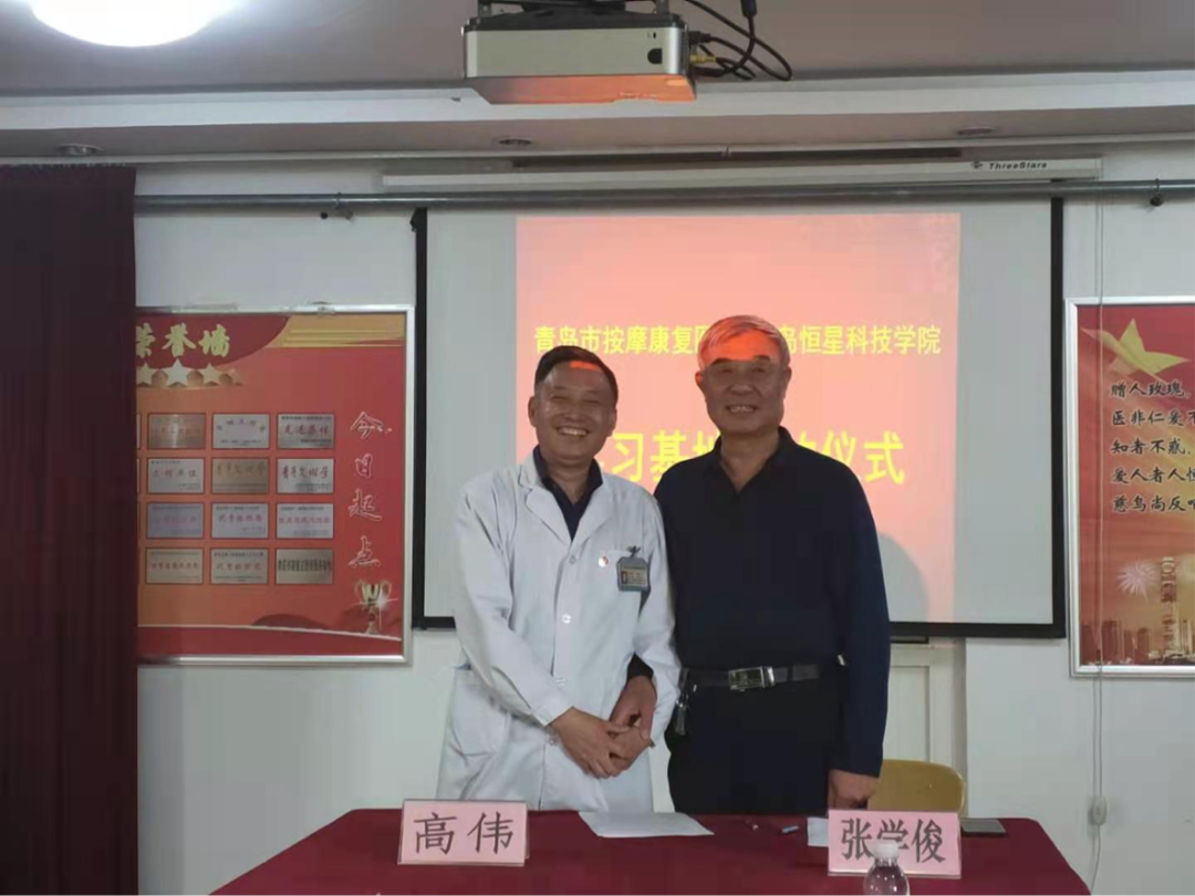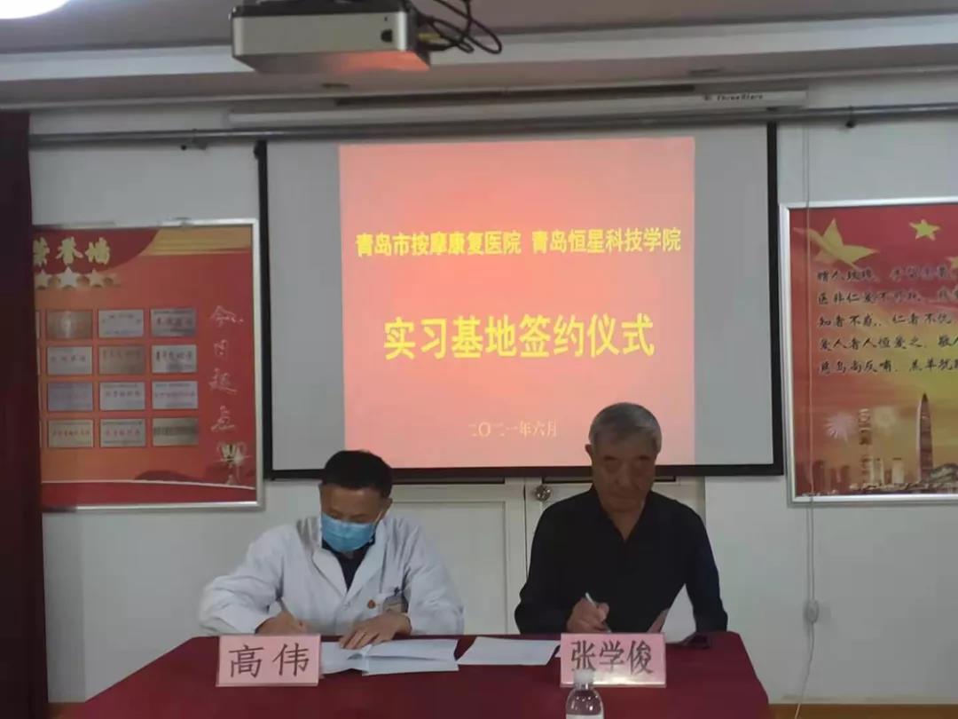 青岛恒星科技学院健康学院张学俊院长、青岛市按摩康复医院院长共同签署协议书。