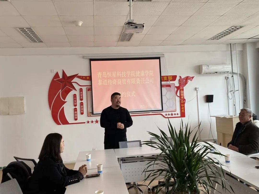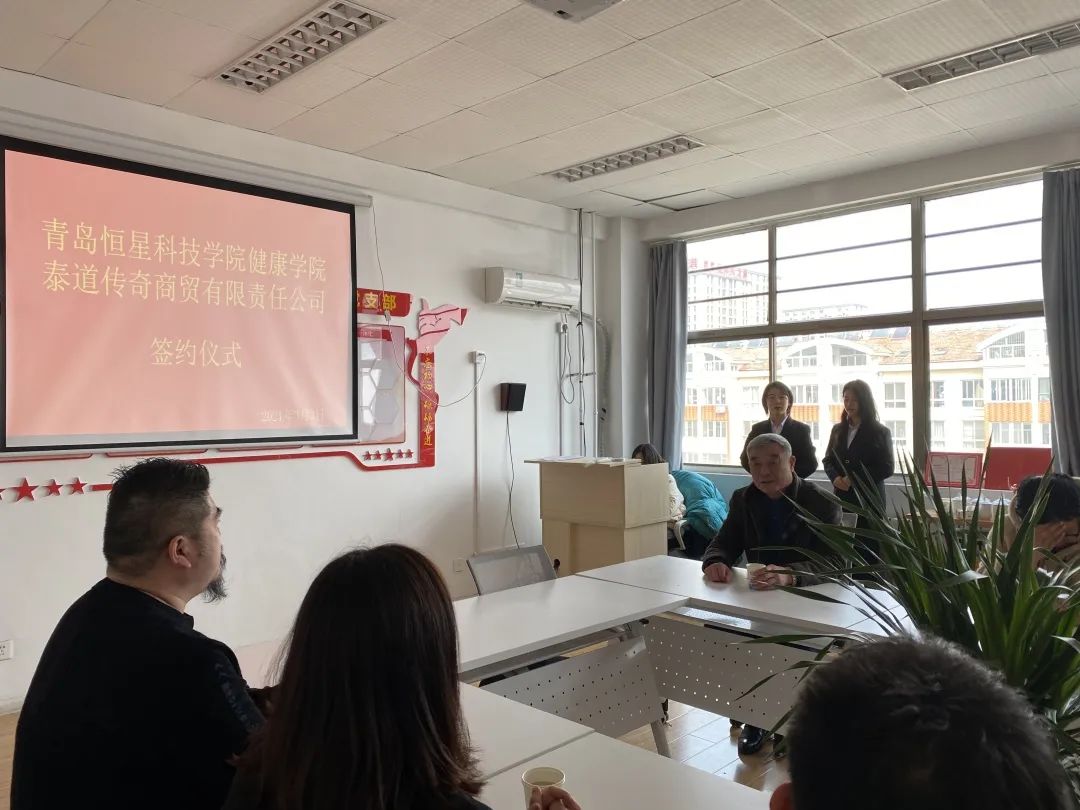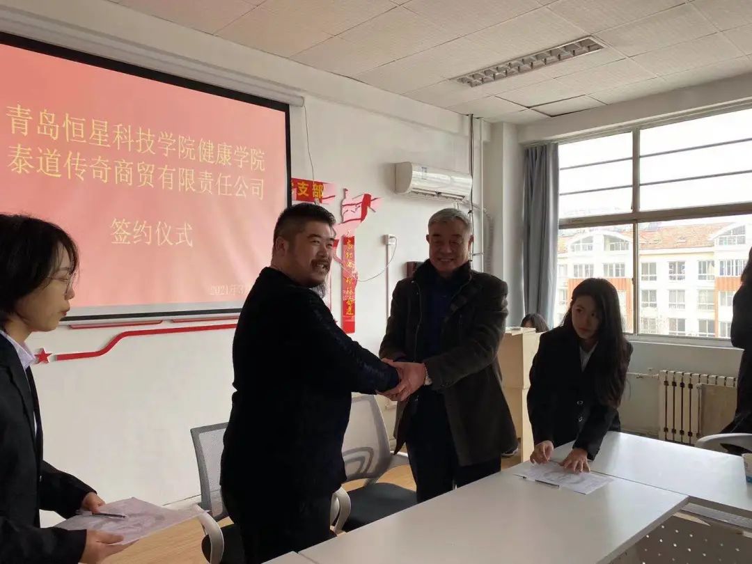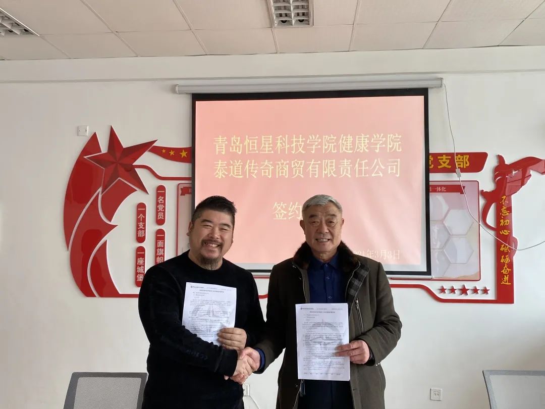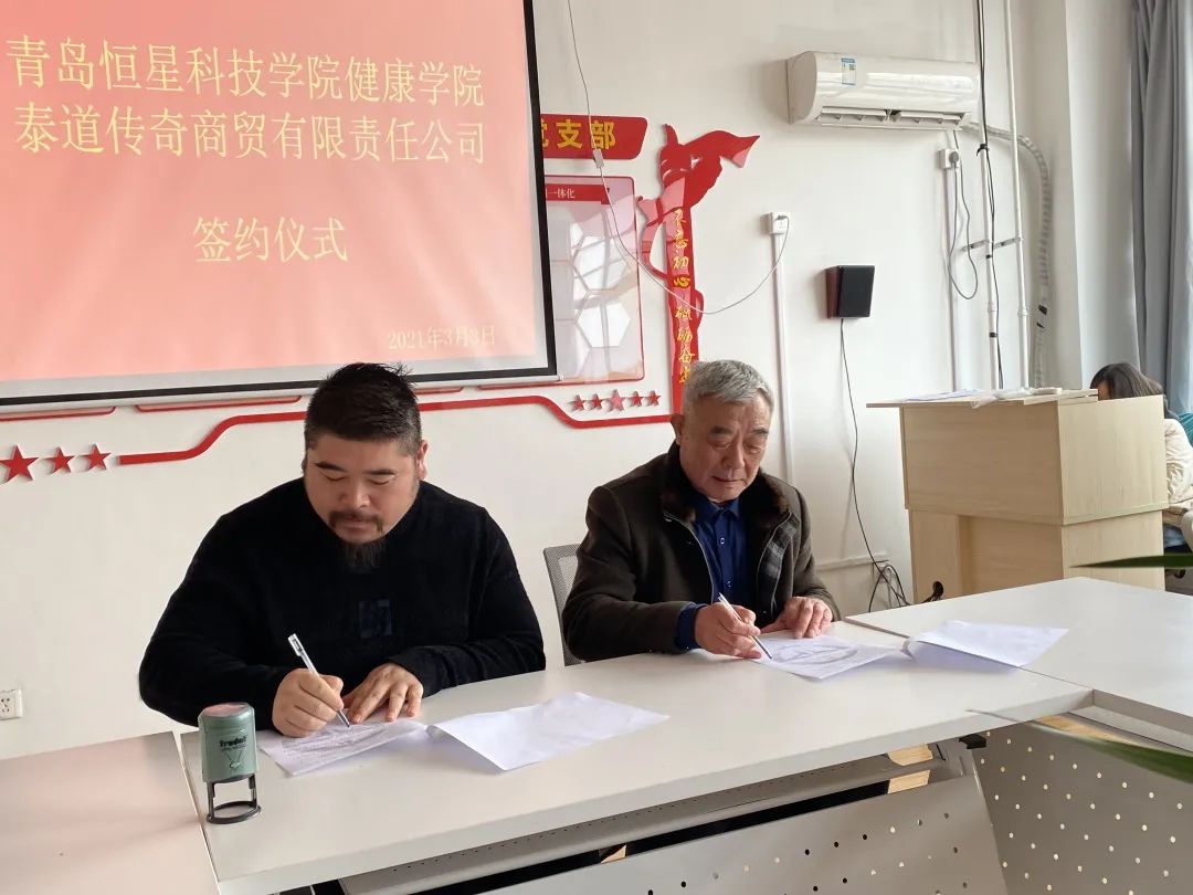 青岛恒星科技学院健康学院张学俊院长、泰道传奇商贸有限责任公司苏子源董事长共同签署协议书。