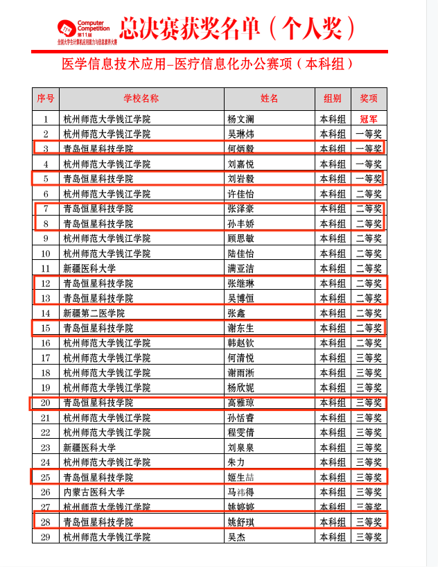 为适应当前高等教育发展新形势,提高学生信息技术应用能力,近日,青岛恒星科技学院健康学院组织学生参加第十一届全国大学生计算机应用能力与信息素养大赛,最终荣获个人奖项一等奖两项,二等奖五项,三等奖三项,团体奖项一等奖。