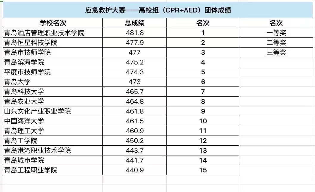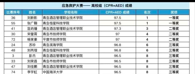 2025年9月26日,青岛市红十字应急救护大赛圆满结束,公布了大赛获奖名单,本次大赛我院获个人奖:一等奖一项,三等奖一项,获团体奖:二等奖。健康管理学院陈文静、王雪花老师带领我院5名大学生参加比赛,其中学生张广翾获高校组(CPR+AED)一等奖,刘芮瑄获高校组(CPR+AED)三等奖,参赛团队总成绩获高校组(CPR+AED)团队奖二等奖,特此报喜!