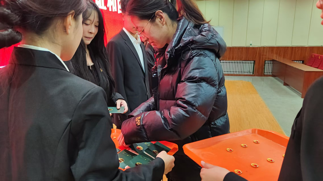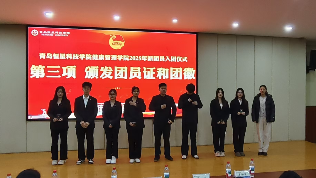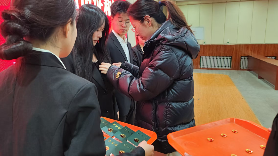 新团员代表上台,学院辅导员江梦慧为他们颁发团员证并佩戴团徽。左胸前闪耀的团徽,是共青团肩负重任的标志,更是新团员们践行责任的起点。