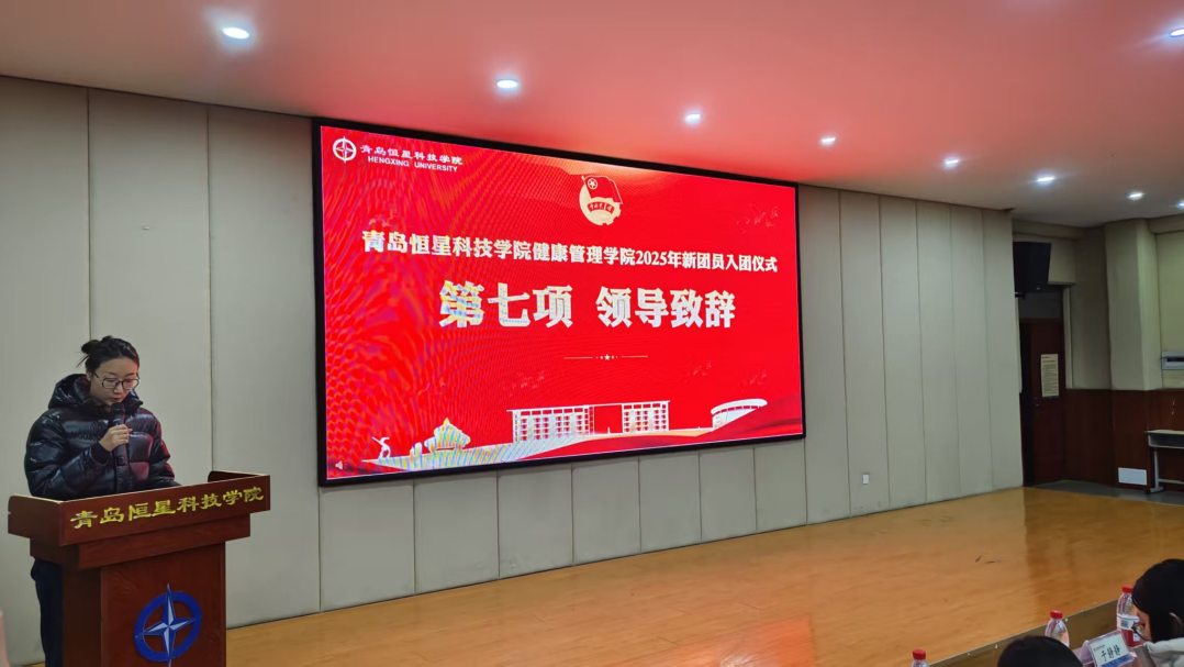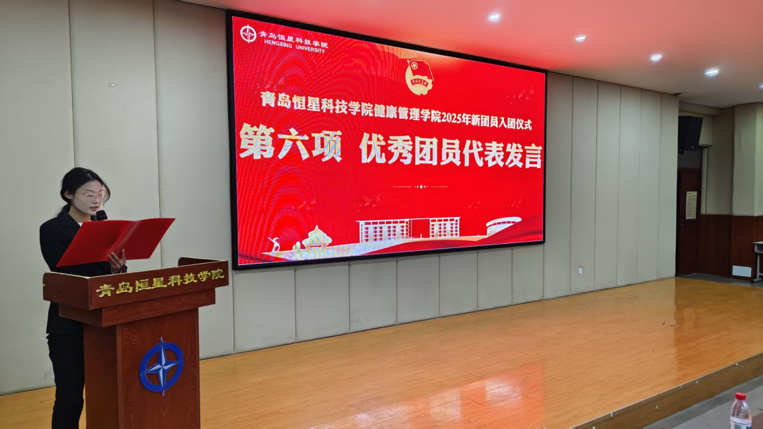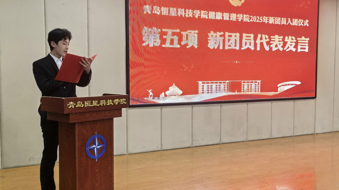 赵博同学作为新团员代表上台,他深情回顾了自己从递交入团申请书到正式入团的历程,分享了对共青团组织的向往与敬畏。他表示,成为共青团员既是荣誉更是责任,未来将以入团誓言为行动指南,在专业学习中深耕细研,扎实掌握专业知识和技能;在校园生活中主动参与志愿服务、文体活动等集体事务,团结同学、乐于助人;在思想上主动向党组织靠拢,积极学习党的理论知识,不断提升自身思想觉悟,用实际行动证明自己无愧于“共青团员”这一光荣称号。