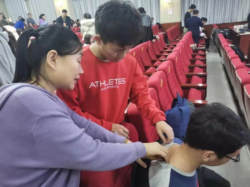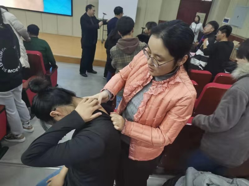 为使大家充分了解中医,相信中医,此次活动的大部分时间均交由了实操课。课堂上,每位同学都得到了助教的指点,找准每个穴位,弄清每个穴位的作用,大家你帮我我帮你,纷纷上手,现场浓厚的学习求知气氛久久不能散去。大厅前方不断播放教学视频,关于感冒发烧或是颈椎病,均是我们现在人都所需要的,蒋教授的良苦用心值得赞扬。