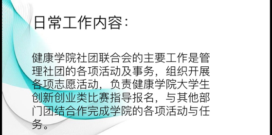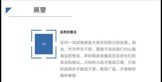 本次会议使健康学院学生会成员对今后的学生会工作开展有了更加深刻的认识和明确的目标与方向,我院学生会必将继往开来,力创新高。