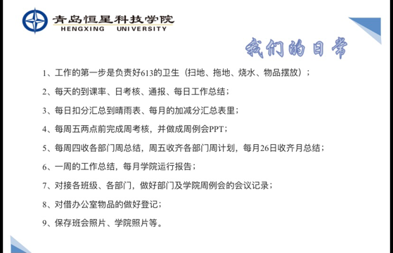 上传时间:为明确学院新学期工作内容重点,增进学生会各部门的联系和互动,调动各部门部员工作积极性。青岛恒星科技学院健康学院于2021年3月1日晚19:00在A8育才楼510教室召开新学期第一周学生会工作例会,本次例会由主席团部署,由学生会主席刘立超主持,辅导员刘笑君、邢艳云、张桐、魏营莅临指导,学生会全体人员参与会议。