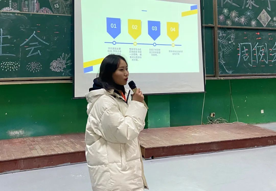 其次发言的是学风主席王欣茹,梳理学风工作存在的问题,回顾及明确新学期工作内容,为新学期的工作做好准备。