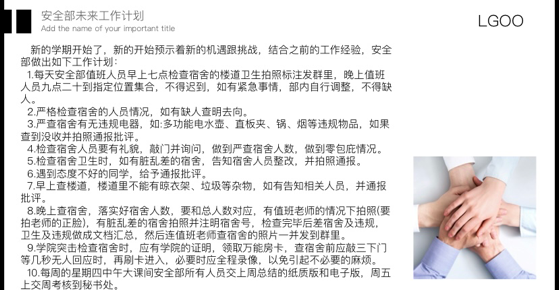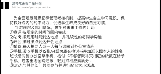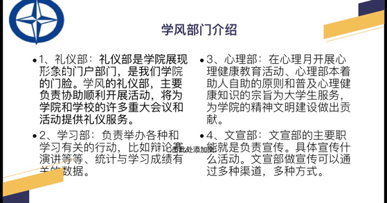 紧接着是自律主席怀亚鑫,针对督导、卫生、生活、安全四个部门的工作计划表明新学期工作目标,带动四个部门为健康学院增光添彩。
