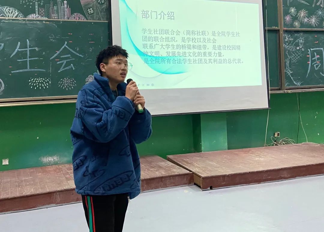 接下来发言的是社联主席丰昊冉,总结了社联日常工作,进一步规划社联未来发展计划,鼓励各社团积极参与各项活动与比赛,吸引更多的同学加入学院社团中来。