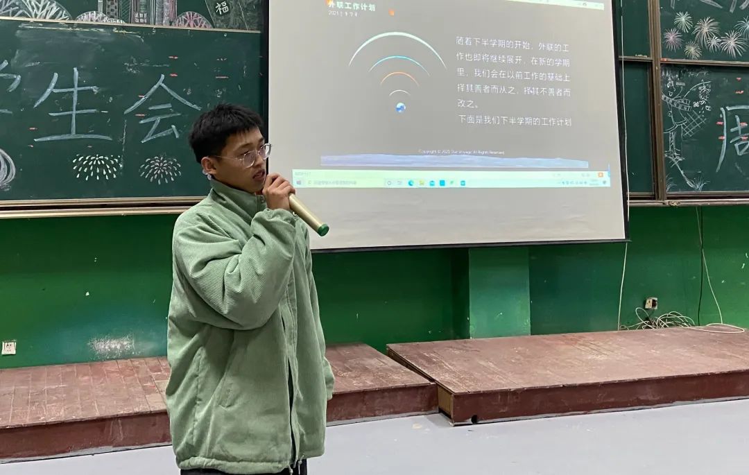 会议伊始,学生会主席刘立超从感谢和展望两个方面出发,简述上学期以来取得的工作成果、总结经验、分析不足,并对本学期的工作做出规划。