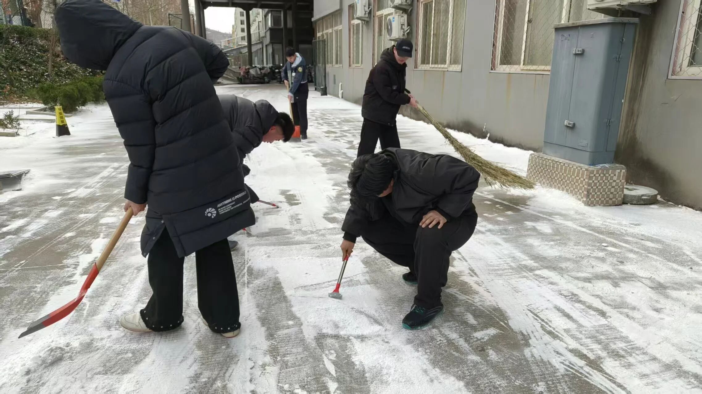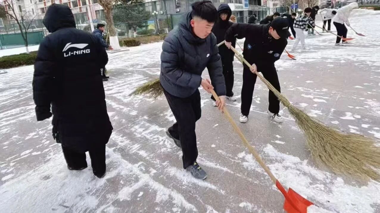 在我院党总支副书记张立夫和辅导员的带领下,同学们迅速行动起来,合力清扫校园里的积雪与积冰。大家分工明确,配合默契:有的同学拿铁镐凿开宿舍楼下入口处的厚冰,有的用铁锹把主通道的积雪推到两侧,还有人拿着扫帚仔细清理台阶缝隙里的残雪碎冰。大家一遍遍地清扫台阶、院子等易滑区域,把残留的冰块都铲除干净,用行动守护大家的出行安全。