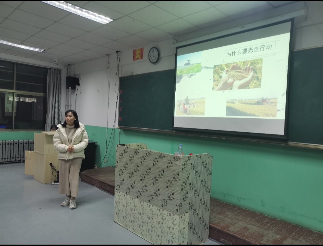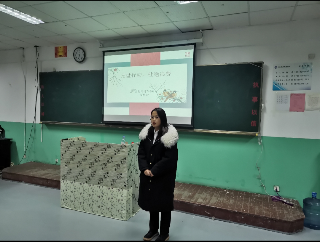 随之,各个班级负责人依次上台进行PPT的讲解,他们大都以幽默诙谐的语调向大家诉说着自己的作品,表达着他们对于实行光盘打卡行动的感想,以最通俗的话语讲述最经典的道理。个个故事都那么的动人心弦,句句号召都那么振奋人心。