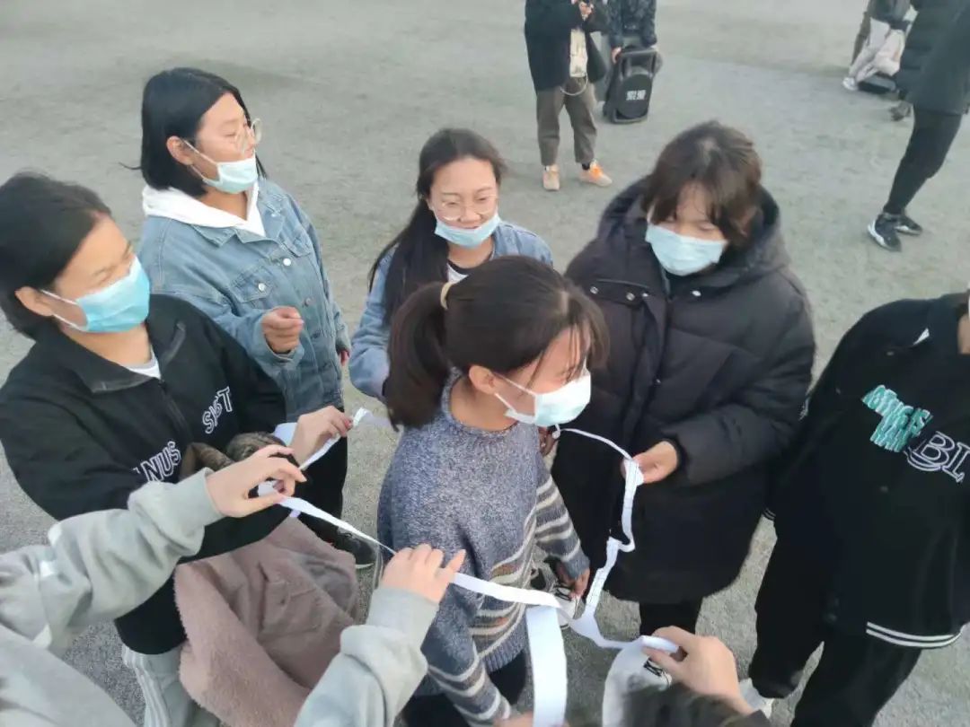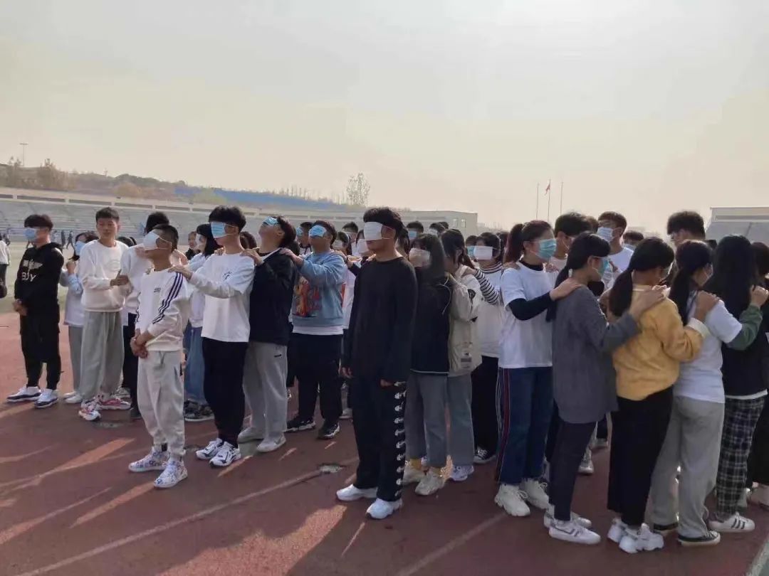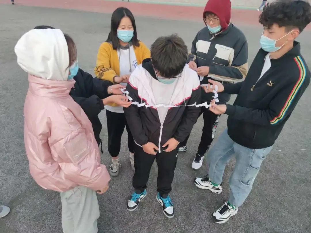 下一个游戏是“蛟龙出海”。每名队员用口罩蒙住自己的眼睛,每个队伍的最后一名队员可以不用戴口罩负责指挥队伍前进,有最后一名队员向前方成员提供信号。好的方向感和团队协作能力是成功的关键。