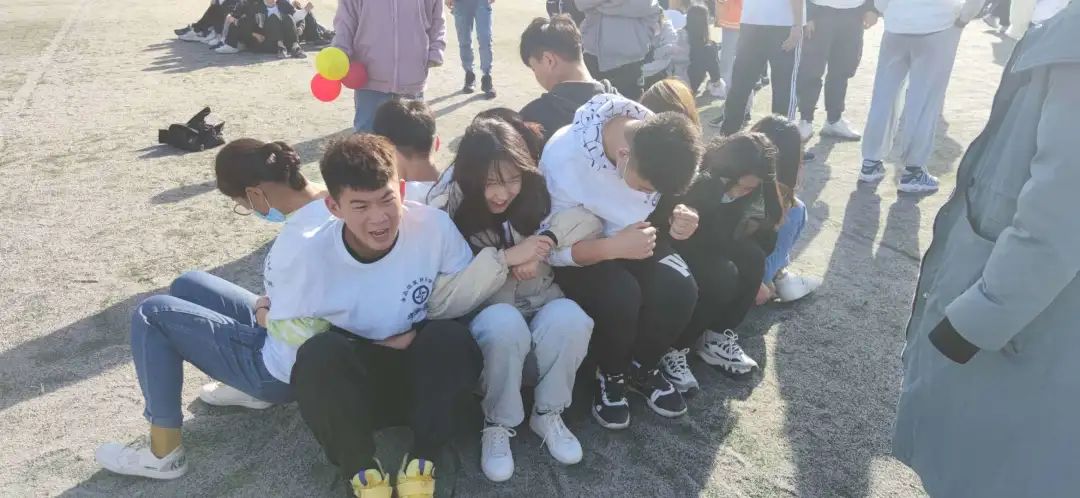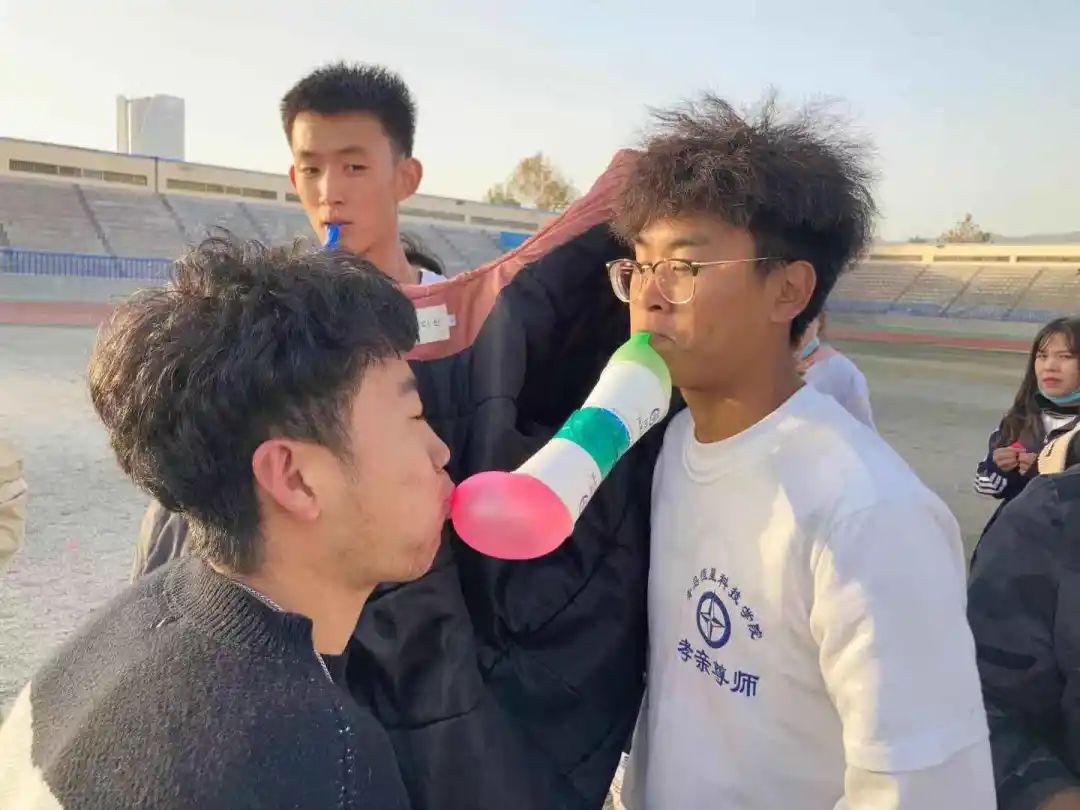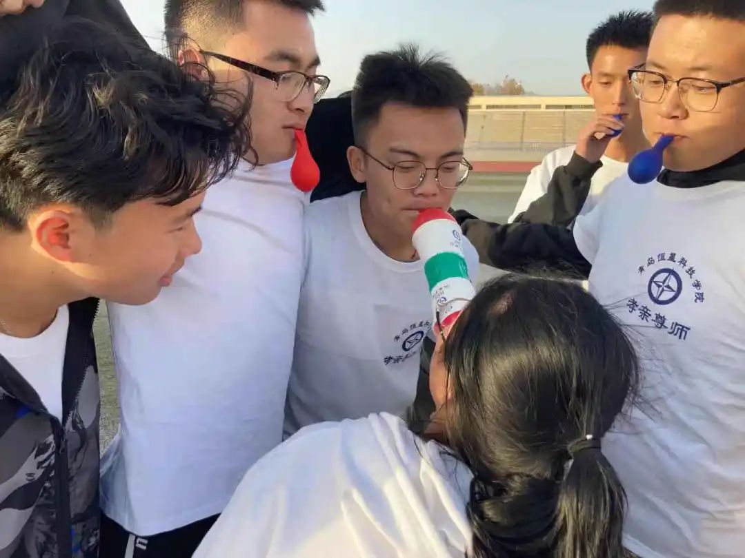 第二天仍然是以跑操开始。伴着太阳的升起开始了第一个游戏“气球蜈蚣”。规则为每人夹着一个气球,后面的人抓住前面人的脚腕,全队一起蹲着前进,最先到达终点且气没掉者即为胜利。