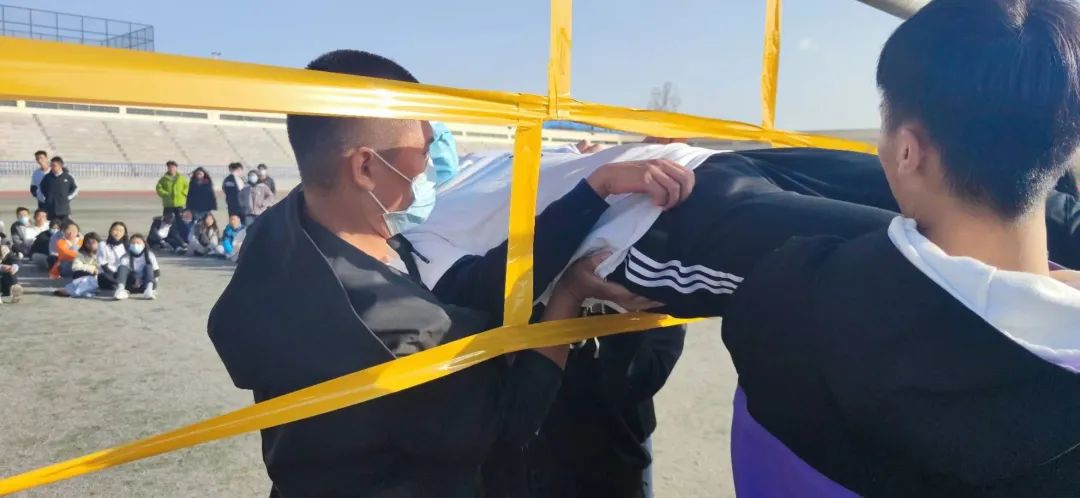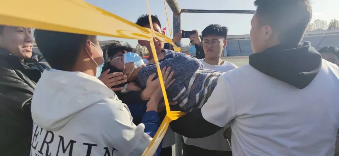 下一个游戏是“鱼跃龙门”,团队齐心协力,将队友举起来,从孔里传过去,考验了队友之间的相互信任和团队协作能力。