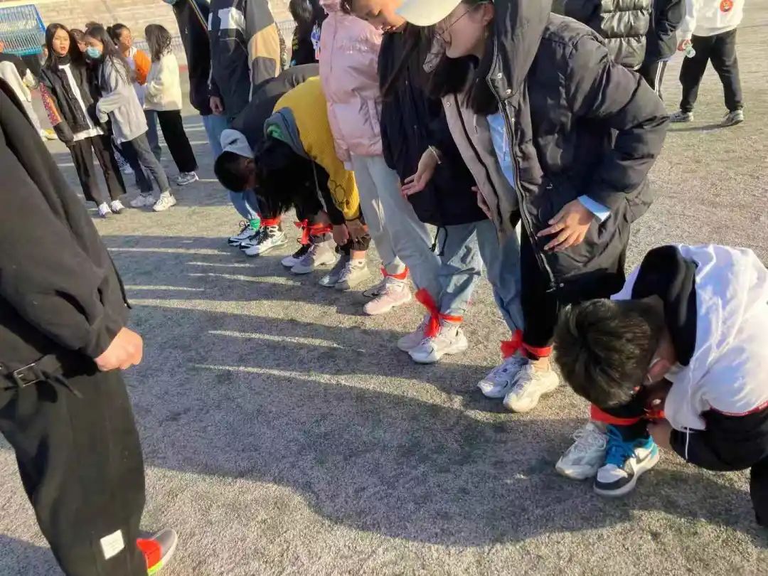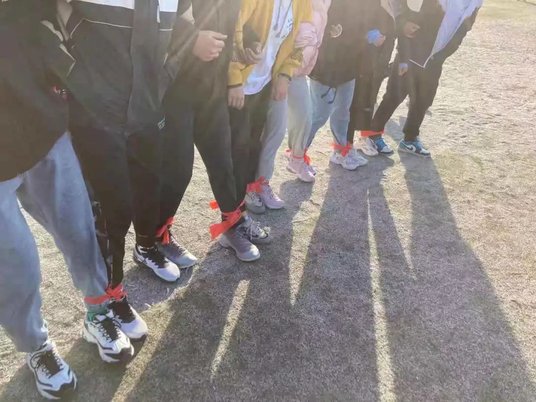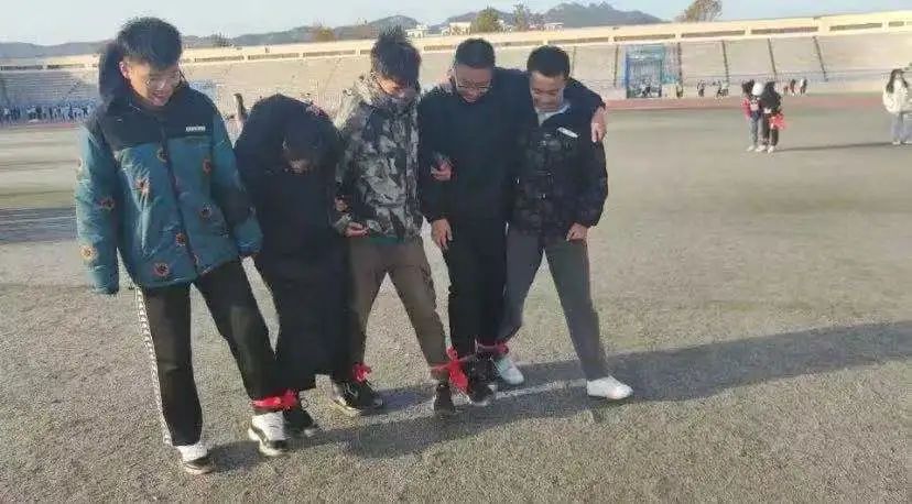 下一个游戏“齐心火车”,每人左手搭在前一名队员的肩膀,右手托起前一个人的左腿,一起前进。